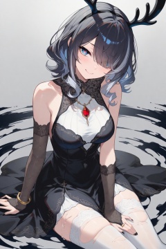 crisp,gwwj,Mika Pikazo,ezu,melting,Tender,masterpiece,best quality,very aesthetic,1girl,extremely delicate and beautiful,Noise and grain,huge filesize,amazing quality,black_nails,blue and black theme,gray background,dark circle around the eyes,blush,streaked hair,torn_thighhighs,dynamic_angle,black hair,curly hair,formal_dress,deer ears,swept bangs,hair_over_one_eye,mesugaki,head_tilt,looking_at_viewer,mature_female,glamor,sitting,portrait,gothic,original,((Monet style)),elegant,dissolving_clothes,antlers,evil smile,closed mouth,leaning_forward,foral_background,arm_support,medium hair,bare shoulders,elbow_gloves,lace-trimmed_gloves,blue eyes,white_bodystocking,pupils,white_pantyhose,bracelet,chest_jewel,monochrome,front view,medium breasts,