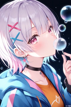 1girl,solo,bubble,looking at viewer,jacket,hood,choker,bubble blowing,hair ornament,multicolored hair,x hair ornament,upper body,hood down,black background,from side,black choker,pink hair,short hair,blunt bangs,orange shirt,hooded jacket,pink eyes,open jacket,blue hair,open clothes,hairclip,blue jacket,hoodie,best quality,amazing quality,very aesthetic,