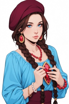 masterpiece, best quality, aesthetic, 1girl, solo, gem, jewelry, white_background, braid, looking_at_viewer, blue_eyes, twin_braids, long_hair, simple_background, earrings, upper_body, necklace, beads, holding, lips, hat, traditional_media, bracelet, long_sleeves, watermark, artist_name, hair_over_shoulder
