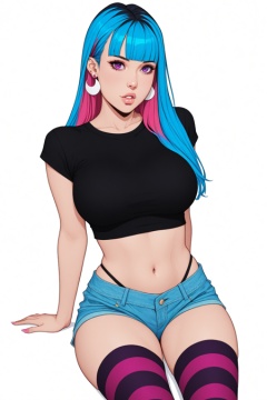 1girl, solo, multicolored_hair, thighhighs, pink_hair, breasts, bangs, navel, looking_at_viewer, striped_thighhighs, long_hair, striped, large_breasts, parted_lips, midriff, crop_top, earrings, simple_background, jewelry, purple_eyes, lips, blue_hair, blunt_bangs, shirt, two-tone_hair, short_sleeves, sitting, underwear, shorts, panties, black_shirt