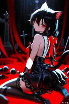 1 girl,Kuroki Monika, Black hair, long hair, low ponytail, braided ponytail, hair above the right eye, luminous eyes, long eyelashes, eyeliner pen, red eyes, big chest, (petite, curvaceous, very cute, kawaii), animal ear hair, animal ear cover, Cat's ears (Steamed cat-ear shaped bread), false animal ear, cat tail, false tail, bell collar, Gothic black luxury dress, red decoration, embroidery, bare shoulders, cloth cutting, chest cutting, back cutting, short skirt, elegant dress, cover, cover ((ribbon, fold)), black lace gloves, black suspenders, shiny suspenders, black thithi gh high socks, cute shoes, solo, lie down, cute seductive pose, fashion model S Posture, elegance, arched back, tilted head, ground view, (shallow focus, depth of field, focused on the eyes), (backlight, dynamic light, natural light), mist shrouded grave, soft glowing mist, bizarre Gothic background, dark and mysterious background, melancholic and charming, raised contours, intricate shadows, high contrast and soft elements, full of Gothic dark Pop Art aesthetics, surreal atmosphere, ultra-fine rendering, soft and striking composition, (anatomy), perfect face, perfect eyes, perfect hands, perfect fingers, masterpiece, best quality, stunning quality, absurd, movie, movie lighting, movie shadows, movie composition The,
