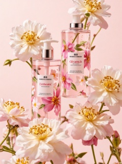 Two perfume bottles, Tall pump dispensers, Predominantly pink, Floral designs, Pink white green, White labels, Black red text, Cleanses softens, Camellia flowers, Large multi-layer, White pink petals, Yellow stamens, Green stems, Sturdy slender, Harmonious composition, Flowers complement, Layered effect,key-998-key