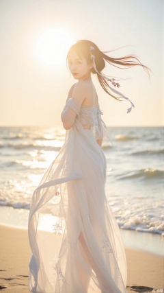 "The picture is set against the background of the morning beach. The golden sunlight shines on the sea surface, sparkling, and the waves gently slap the golden beach. The figure of Liu Shen stands gracefully on the coast. The breeze blows gently, her long hair is as flowing as silk, and the tips of her hair are dotted with a few blooming silver lotus, exuding a faint brilliance. She is wearing a simple and flowing white long skirt, and the hem of the skirt dances with the wind, as if a fairy is descending on the earth. Liu Shen's posture is elegant and calm, with a deep gaze, as if she has seen through time and space. There is a gentle smile on the corner of her mouth, which makes people feel awe Behind her is the beautiful scenery of the sea and the sky. On the distant sea level, a red sun slowly rises, adding a hint of sacredness and hope to the whole picture. The patterns on the gauze dress are like the patterns of natural laws, flowing with the wind, symbolizing her control over the world and everything. On the beach under her feet, a few silver willow leaves gently fall, as if she was her gentle whispering to this world. The overall color is mainly the golden color of the morning light and the blue color of the sea, warm and fresh, creating a peaceful and sacred atmosphere, perfectly showing the nobility and mystery of the willow god by the sea. "