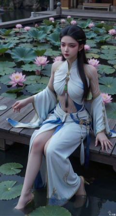 (masterpiece:1.2),best quality,The image is a digital illustration of a young woman sitting on a wooden bench in a pond with lily pads. She is wearing a long dress with design on the chest and sleeves. The dress has a high neckline and short sleeves,Holding a lotus in hand. She has long dark hair styled in loose waves and is wearing gold high heels. The woman is posing with one hand on her hip and the other resting on the edge of the bench. The background is filled with pink and white lotus flowers and green leaves. The overall mood of the image is peaceful and serene,(huge breasts:2.99),(full breasts:2.99),(Background with traditional Chinese architecture, lotus pond and pink lotus flowers:1.39),XzhihuaX,Xleidianjiangjun,Xyuenanaodai,XmeiningSMW