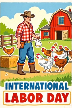 Cartoon illustration,,A farm worker in a rustic outfit feeds chickens in a well-maintained chicken farm on International Labor Day. The scene is depicted in an artistic font style with bold and vibrant colors. The farmworker wears a checked shirt and rubber boots, holding a bag of feed, while chickens gather eagerly around. The farm environment includes wooden fences, hay bales, and a red barn in the background, illuminated by the warm sunlight of late afternoon. The overall composition is balanced and harmonious, capturing the essence of hard work and rural life.