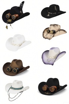Cowboy hats with diverse designs. A black hat with steampunk - style goggles; brown hats with feather and bead adornments; a black hat with a leather band and metal buckle; a white hat with a snake - skin pattern; a hat with a gradient from purple to black; a white hat with a turquoise - embellished band; and others featuring intricate embroidery and unique textures.