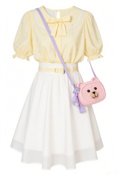 A light yellow short - sleeved blouse with puff sleeves, adorned with small floral patterns and a bow at the neckline. A white A - line skirt with a matching light yellow belt. A crocheted pink teddy - bear - shaped crossbody bag with a purple strap and ribbon. Beige Mary - Jane shoes with cross - strap detailing. The overall look is sweet and girlish, perfect for a spring or summer day.