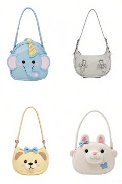 Cute - style bags. A light blue backpack shaped like an elephant, adorned with a party hat and paw prints. A light gray handbag with bow and heart - shaped decorations. A white plush rabbit - themed backpack with a blue bow. A yellow plush dog - shaped backpack, complete with a pink bow on its head. These bags are perfect for adding a touch of charm to outfits and are great for those with a penchant for cute accessories.