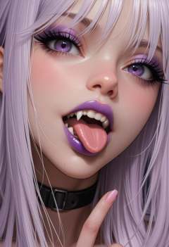 1girl, detailed eyes, (slender, lean, fit, athletic:2), ((sexy)), defined midriff, skindentations, large breasts, fake breasts, (perfect body:2), photo-realistic, realistic skin, realistic textures, detailed skin, photorealistic, ultrarealistic, 8k, A close-up, digital illustration shoot from a portrait camera angle, about a close up portrait of a woman with striking purple eyes and long, straight, light purple hair, displaying a playful and seductive expression with her tongue sticking out. the subject, a 1girl, is positioned in the middle of the image, with her upper body facing the viewer and her eyes looking directly at the viewer. she has a slim body and is wearing a black choker around her neck. her hair is long and straight, with a few strands falling down her back, and her purple eyes are adorned with purple eyeshadow and eyelashes. her lips are painted with dark purple lipstick, giving her a glossy finish. her tongue is sticking out slightly, with sharp, pointed fangs visible. the background is a simple gradient of light purple to dark purple, and the lighting is soft and even, highlighting her features and creating a dramatic effect. the image has a high-quality, detailed style with a focus on the character's expressive face and the glossy texture of her hair. 1girl, tongue, solo, tongue out, fangs, purple eyes, makeup, looking at viewer, long hair, open mouth, fingernails, portrait, teeth, close-up, choker, purple lips, rating:general, black choker, eyelashes, eyeshadow, white hair, lipstick, rating:sensitive, collar, purple tongue, rating_sensitive, score_9, score_8_up, score_7_up