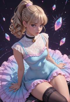 masterpiece, detailed_eyes, high_quality, best_quality, highres, absurdres, 8k, subject_focus, depth_of_field, PG,1girl, woman, blonde_hair, brown_hair, curly_hair, ponytail with braid, long_hair, hair_behind_ear, slightly messy bangs, mascara, long_lashes, sultry_gaze, small_waist, saggy_breasts, small_breasts, wide_hips, thick_thighs, slim, (single_thighhigh), frilly_dress, turtleneck_dress, choker, bell, vaporwave_colors, Twilight clouds, kaleidoscopic fragments, kaleidoscopic_crystals, neon particles, black_background, flirty, legs_crossed, high_angle, dynamic_view, summer_breeze,