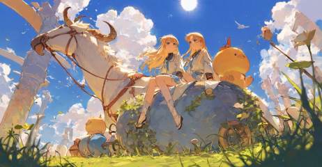 highres,extremely detailed 8k wallpaper,illustration,depth of field,great quality,masterpiece,best quality,amazing quality,very aesthetic,absurdres,Japanese fantasy style,artist:ciloranko BREAK<lora:Japanese fantasy style:0.8>, -Japanese fantasy style, blonde hair, long hair, sitting, 1girl, outdoors, sky, grass, cloud, sun, day, blue eyes, bird, blue sky, leaf