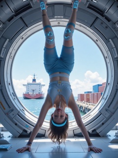 A mid-shot of a ring-shaped space station,where an Asian woman is performing an inversion in the artificial gravity zone,wearing a gradient blue pressurized suit with adjustable waist for emergency life support. She supports herself with her hands on the ground,her legs spread at a 90-degree angle,and the magnetic rings around her ankles display gravity adjustment parameters. The electrostimulation module embedded in her sports bra emits a faint blue glow,while her smart headband projects a real-time stream of calorie consumption data. In the background,outside the porthole window,a cargo ship is docking. Floating water droplets form diamond-**** geometric structures due to centrifugal force. A straw at the corner of her mouth connects to a sports drink bag containing nanorepair factors. Protective pads on her knees have virtual stickers sent by fans through the Earth-Moon network attached to them.,