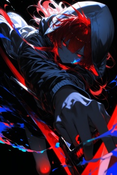 masterpiece,best quality,amazing quality,very aesthetic,absurdres,newest,(yoneyama mai),(noyu (noyu23386566)),(wanke:1.1),(senpen:1.1),lineart,monochrome,(red sword:1.2),(fighting stance:1.2),(disheveled hair:1.1),(dark theme:1.2),chiaroscuro,foreshortening,(colorful splashes:1.1),(shining:1.1),(focus on face:1.1),Glowing skin,Strong contrast,long sleeves,simple background,red eyes,weapon,hood,black background,sword,hooded jacket,jacket,hood up,red long hair,glowing,half-closed eyes,looking at viewer,