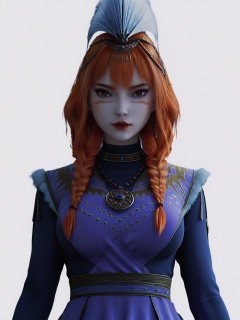 score_9,<lora:SF_SiYuDan_Pony_Realism2.3-000004:0.7>,1girl,solo,dress,orange hair,bangs, large breasts,multiple braids,twin braids,facepaint,facial mark,feathers,hair over shoulder,long sleeves,lipstick, hair ornament,standing,looking at viewer,white background,