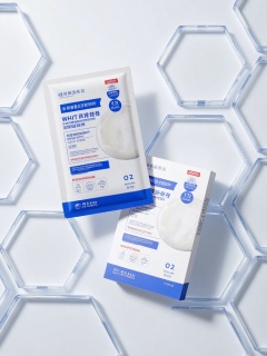 The image features a set of skincare products specializing in whitening and spot-removing effects, including a firming mask labeled "01" and a massage cream labeled "02", both in minimalist blue-and-white packaging indicating net contents as "25ml×5 sheets" for masks and "3g" for cream. Surrounded by transparent geometric decorations against a technologically styled gradient background, the products prominently display key ingredients **** "Whitening", "Spot-Removing", "Sodium Hyaluronate" and "Niacinamide", with special emphasis on functional benefits such as "inhibiting melanin" and "improving skin tone". Through clear numeric labeling, highlighted ingredient efficacy statements and modern geometric elements, the composition creates a professional precision-whitening skincare solution image.