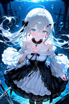 1girl skull dress underwater blue eyes solo long hair looking at viewer weapon black dress frills long sleeves bubble floating hair sword ribbon air bubble frilled dress hair between eyes jewelry white hair black footwear skeleton hair ribbon black ribbon laptop grey hair lolita fashion parted lips ruins book computer white dress off shoulder black bow necklace hair bow gothic lolita off-shoulder dress skull necklace very long hair bow ahoge detached collar hand up corset black corset submerged high heels wide sleeves purple gemstone breasts frilled sleeves crossed bangs braid flower bare shoulders collar gem planted center frills cave chain hand on own chest knife outdoors pale skin watercraft dark frilled collar pendant shoes reaching layered dress dagger tombstone water treasure chest closed mouth expressionless planted sword ship feet out of frame two-tone dress night reaching towards viewer bone hair ornament blush collarbone dark background cross small breasts open mouth pearl (gemstone) earrings long dress medium breasts petticoat