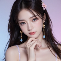 baoshi,lvjing,xiaomei,pifu,black hair,long hair,grey eyes,fair_skin,earrings,jewelry,1girl,solo,pantyhose,brown hair,dress,hair ornament,makeup,brown eyes,long hair,1,cover,gradient background,close-up details,outstanding style,adding a touch of dimension to your images without compromising details,close-up