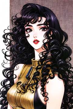 clover, 1girl, solo, black hair,  curly hair, lipstick, makeup, long hair, red lips, breasts, <lora:clover:0.8>