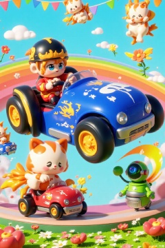 This image depicts a vibrant and whimsical cartoon scene. The main subject is a blue race car with flame patterns on the body and black tires with yellow stripes. The driver, dressed in a red racing suit and wearing a black helmet, grips the steering wheel firmly with a resolute look. The car is racing on a rainbow track surrounded by colorful flowers and fluttering flags. Flying in the sky are several winged kittens with white and orange fur. In the lower right corner of the image, there is a green fuel robot waving a fuel gun.