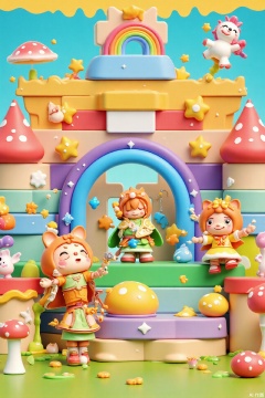 3d,This image displays a vibrant and whimsical cartoon scene. The main subject is a fairy tale castle built with colorful blocks. In front of the castle are two cartoon characters. One is a little hedgehog wearing a green knight's suit and an orange cape, holding a gem-encrusted sword. The other is a little fox dressed in a yellow dress and a bow headband, excitedly pointing at the castle gate. Around the castle, glowing mushrooms sway gently, and fairies carrying lanterns flutter about. At the top of the castle tower, a rainbow-colored unicorn is neighing happily. The gate is decorated with twinkling star patterns, and the entire scene exudes a dreamy and adventurous atmosphere.