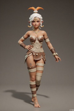 Disney style,Pixar 3D illustration,Theres a lone girl who is an orc. Her hair is white and fashioned into a single long braid. She boasts medium breasts, a tanned skin tone, and fiery red eyes. A tattoo is visible on her skin, and she goes barefoot. Her attire is a unique dress with bandages and jewelry accents. A headpiece adorned with feathers sits atop her head, giving her an exotic look.