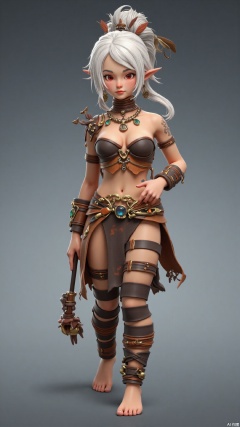 Disney style,Pixar 3D illustration,Heres a lone orc girl. Her white hair is in a single long braid. She has medium breasts, a porcelain - like skin tone (another different skin tone option), and red eyes that draw you in. A tattoo is present on her, and shes walking barefoot. Her dress is a combination of bandages and jewelry, looking quite distinctive. A feather - adorned headpiece sits gracefully on her head, making her stand out.
