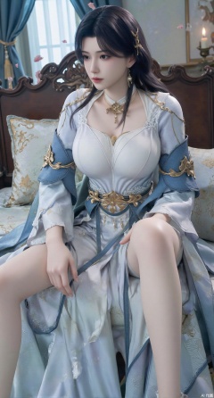 (masterpiece, best quality:1.2),Ancient Chinese boudoir scene, Hanfu dress ,sitting sideways on an intricately carved wooden bed, soft natural light filtering through sheer silk curtains, satin bedding with delicate sheen, detailed traditional Chinese Gongbi painting style, subtle celadon color palette, background featuring vintage dressing table and embroidered screen, falling plum blossom petals near window and wispy smoke from bronze incense burner, 8K resolution with intricate fabric draping and wood grain textures,,(huge breasts:2.99),(full breasts:2.99),XyunyunXY,Xmeining,Xjiangziyue,Xweinina,Xyunxiao,Xxiaoqingxue,Xlenhuan