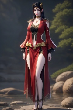 1girl, solo, long hair, breasts, looking at viewer, black hair, dress, navel, jewelry, standing, full body, earrings, pointy ears, necklace, high heels, clothing cutout, red dress, elf, navel cutout,