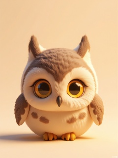 Photorealistic CGI image of a tiny owl chick with fluffy feathers, large yellow eyes, and a feathered crest. It huddles on a branch charm, against a peach-colored background. Soft, diffused lighting enhances its innocent gaze.