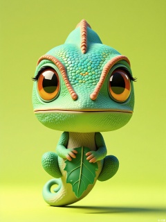 High-quality CGI image of a baby chameleon with iridescent scales, bulging eyes, and a prehensile tail. It clings to a leaf-shaped charm, against a lime-green background. The style balances realism with a whimsical, storybook aesthetic.