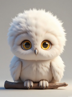 Detailed CGI image of a snowy owl chick with fluffy feathers, golden eyes, and a feathered crest. It huddles on a branch charm, against a soft-gray background. The style balances realism with a dreamy, ethereal quality.