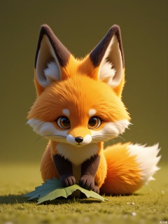 Photorealistic CGI image of a red fox kit with russet fur, alert ears, and a bushy tail. It pounces playfully on a leaf-shaped charm, against a moss-green background. Subtle motion blur adds dynamic energy.