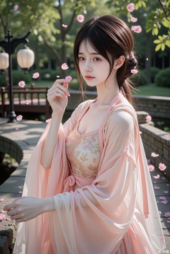The Asian woman in Hanfu gazes sadly at the falling pink petals around her. Her makeup is elegant yet subtle, with a light pink lip color and delicate black eyeliner enhancing her sorrowful expression. Her long black hair is tied into an elegant low bun, with a few strands loosely framing her face. She wears a flowing pale pink Hanfu dress, its wide sleeves and layered fabric fluttering softly in the breeze. The scene is a serene garden with stone lanterns and curved wooden bridges. Petals float in the air and gently settle on her shoulders and the ground around her. She gently lifts her hand, letting a petal land on her palm. The camera captures her from a side angle, slightly above eye level, with a medium close-up framing that focuses on her upper body and face. Her expression is one of quiet melancholy as she looks at the viewer with a sense of longing. The lighting is cinematic, with soft shadows and highlights creating a dreamy atmosphere. The skin appears shiny and smooth, adding to the aesthetic appeal of the image. Ray tracing enhances the realism of the scene, making the petals and fabric appear lifelike. The overall mood is very aesthetic and cinematic, with a focus on the beauty and sadness of the moment.