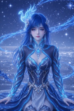 191 flat coloring. This image prompt depicts an animated woman with bright colors, detailed background and long blue hair. She wears exquisite hair accessories, including headdress. Using the double exposure effect, you can see the beautiful rose sea, starry sky and stars in the sky through her silhouette. In addition, a glowing phoenix is depicted in the sky. The characters and the background blend together to create a fantastic aesthetic feeling. The overall style combines realism, 3D rendering, magical realism, surrealism and bright colors, blurring the boundaries between reality and fantasy. The overall color is blue. 1 girl, solo, long hair, audience watching, blue eyes, dress, medium blue hair, hollow clothes, glowing, long sleeves. Sit down and close up your upper body.