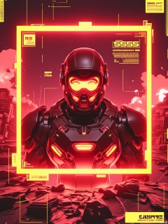 SBPK, A digital artwork showcasing a close-up of a face encased in a pulsating crimson frame. The face is lit by a fierce, scarlet light, contrasting with the dark, war-torn battlefield. The figure wears a reinforced battlesuit and a visor displaying enemy data, surrounded by explosions and debris. The image has a cyberpunk aesthetic with neon accents and a chaotic, intense vibe.