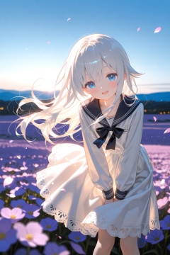 masterpiece,best quality,high quality,loli,chromatic_aberration,//,(cinematic lighting:0.4),(pastel color \(medium\):1),adorable,1girl standing on a vast flower field,pale-white hair,(wavy long hair),lace white serafuku dress,landscape,beautiful blue sky,head tilt,bloom effect,fantastic atmosphere,overlooking magnificent view,open mouth smile,wind,(petals),optical flare,v-arms,leaning forward,the light gives off a dreamy glow,blurred edges,bokeh,front view,blurry,(depth of field:1.2),//,official art,depth of field,detailed light,blurry background,cinematic lighting,ray tracing,ultra detailed,god rays,backlighting,photo background,film grain,chromatic aberration,volumetric lighting,depth of field,blurry background,shiny skin,floating hair,cinematic lighting,day,very aesthetic,