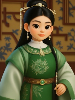 GFRW, A youthful Asian woman with jet-black hair in a sleek high bun, wearing emerald silk hanfu with gold phoenix embroidery, jade hairpin, silver filigree earrings. Soft gaze, blurred crimson lattice background, diffused golden hour light accentuating fabric textures.