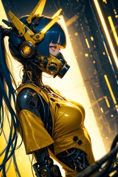 masterpiece,best quality,amazing quality,very aesthetic,absurdres,newest,extreme aesthetic,in the style of fashion photography,light particles,cinematic lighting,Visual impact,sharp focus,Emotionalization,depth of field,dutch angle,scenery,1girl,solo,long_hair,breasts,bangs,simple_background,shirt,medium_breasts,blue_hair,jacket,yellow_eyes,upper_body,ponytail,short_sleeves,shiny,blunt_bangs,from_side,profile,mask,headgear,yellow_background,yellow_shirt,android,joints,cable,yellow_jacket,mechanical_arms,cyborg,robot_joints,yellow_theme,cyberpunk,mechanical_parts,respirator,mechanical_ears,