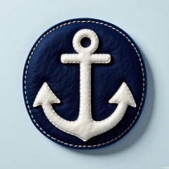 MZTB, Photograph of a circular, navy blue felt emblem with a silver, embroidered anchor symbol in a nautical, detailed style. The emblem has a dense, velvety texture and is outlined with silver thread. The background is a light grayish-blue. The lighting is clear and detailed, highlighting the emblem's maritime theme and the depth of the felt. The emblem is centered in the composition, with a subtle shadow enhancing its three-dimensional effect. The style is simple and nautical, focusing on the emblem's design and tactile appeal.