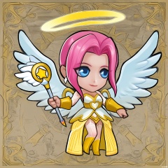 OKJS, A digital illustration of a chibi-style character with long pink hair, blue eyes, and angel wings. The character wears a flowing white and gold gown with intricate lace details and a halo floating above their head, clutching a wand tipped with a sparkling diamond. Their expression is serene and compassionate. The background is a simple white. The style is reminiscent of fantasy anime and magical girl designs.