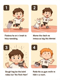 MHCT, Digital drawing in a cute, cartoon style, featuring four panels arranged in a grid. Each panel shows a young athlete with a tracksuit and sneakers, interacting with a rabbit. The top left panel shows the athlete holding a stopwatch and a water bottle, with a rabbit hopping nearby. The top right panel depicts the athlete and the rabbit racing on a track, the rabbit leading the way. The bottom left panel shows the athlete and the rabbit crossing the finish line together, the rabbit jumping for joy. The bottom right panel shows the athlete and the rabbit celebrating with a high-five, both out of breath but smiling.
