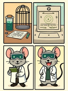 MHCT, Digital drawing in a cute, cartoon style, featuring four panels arranged in a grid. Each panel shows a little scientist with a lab coat and goggles, interacting with a mouse. The top left panel shows the scientist holding a test tube and a notebook, with a mouse in a cage. The top right panel depicts the scientist conducting an experiment, the mouse observing with interest. The bottom left panel shows the scientist and the mouse discovering a new compound, both looking excited. The bottom right panel shows the scientist and the mouse sharing the results, the mouse holding a tiny certificate.