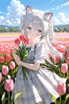 1girl, solo, animal ears, flower, short sleeves, puffy short sleeves, tulip, puffy sleeves, blue eyes, dress, outdoors, smile, plaid dress, holding flower, long hair, blush, sky, red flower, day, hair between eyes, grey hair, holding, plaid, closed mouth, petals, very long hair, cloud, blue sky, bow, depth of field, hand up, hair bow, blurry, grey dress, cat ears, two side up, hair ribbon, pink flower, white bow, field, ribbon, white ribbon, cloudy sky, flower field, blurry foreground, multicolored hair, looking at viewer, criss-cross halter, signature, halterneck, frills, blurry background, white dress, two-tone hair, standing, rose, animal ear fluff, white hair, collarbone, hugging object, cat girl, hands up, head tilt, heart, looking to the side, red rose