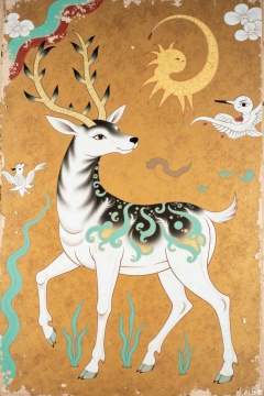 The Dunhuang mural style is a nine-color deer with snow-white main body, the fur has crescent-shaped patterns, the pattern color is dark green, earthy yellow, and ochre red gradient, the antlers are golden branches, and the back is suspended. The background is filled with flying patterns and curly grass patterns, and mineral pigment texture is used. The overall picture is warm and gold tones. The fine brushwork and heavy color techniques are expressed, with the peeling texture of the mural, and the symmetrical composition shows the sacred sense.