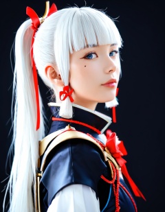 score_9,score_8_up,score_7_up,i want the whole image to be created in 3D anime style,1girl,solo,long hair,looking at viewer,bangs,blue eyes,simple background,hair ornament,ribbon,closed mouth,hair ribbon,ponytail,white hair,sidelocks,black gloves,blunt bangs,armor,mole,from side,lips,looking to the side,petals,mole under eye,black background,portrait,tress ribbon,realistic,nose,kamisato ayaka,