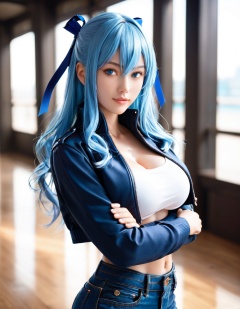 score_9,score_8_up,score_7_up,1girl,solo,best quality,highres,masterpiece,long hair,blue hair,blue eyes,bangs,hair between eyes,hair ribbon,large breasts,cropped jacket,jeans,crossed arms,