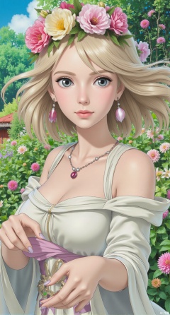 (masterpiece:1.2),best quality,illustration_CHLO,Studio Ghibli,Studio Ghibli style,Ghibli style,Here is the refined,Illustration of a majestic garden goddess in Studio Ghibli style, inspired by Hayao Miyazaki, with ultra-detailed, 8K, high-resolution, and extremely sharp features, delicate facial expressions, flowing hair adorned with petals, surrounded by vibrant, blooming flowers and lush greenery, soft and dreamy lighting, and an enchanting, serene atmosphere, evoking a sense of whimsy and wonder in an award-winning, 32K masterpiece..,XliumeiYK,XlishaoyingXK,XGhibli animation style