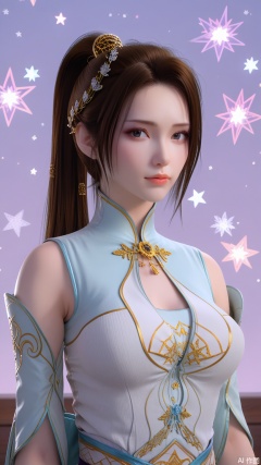 score_9_up,score_8_up,score_7_up, (high definition, Best quality, masterpiece, 4K, exquisite skin), perfect_anatomy, (starlight and beam background:1.1), 1girl, solo, big breasts, looking at viewer, ponytail holder, upper_body