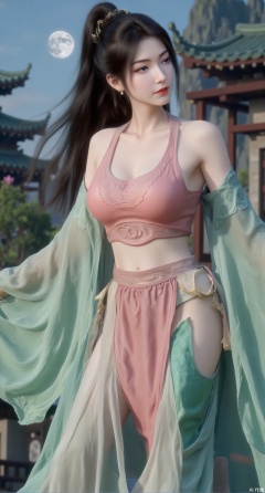 BREAK,blurry, solo focus, long hair, lips, daytime, lipstick, outdoors, standing,upper body,(huge breasts:2.99), (full breasts:2.99),background, solo, makeup,Xyunxiao,(Lotus,Water Lily,Blue sky,full moon:1.39),(Lotus pond,ancient Chinese architecture:1.39),Xmupeiling,XsongyuYK