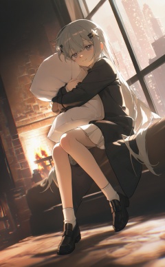 masterpiece,very aware,highres,absurdres,newest,best quality,loli,petite,high quality,chromatic_aberration,//,(1girl:0.6),thin,very long hair,grey hair,deep grey hair end,grey eyes,(detailed eyes),small breasts,(black coat),white lining,white skirt,socks,shoes,closed mouth,(happy),smile,star hairpin,Bow head,sitting in bed,hugging Pillow,{white flower},cityscape in window,pantyhose,fireplace,(dark night),masterpiece,best quality,official art,extremely detailed CG unity 8k wallpaper,cozy anime,backlight,(wide shot:0.95),Dynamic angle,fanxing,(full body),cozy anime,//,<lora:konya_karasue——【noob】hans:0.8>,